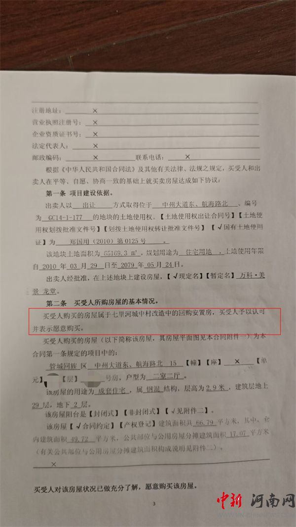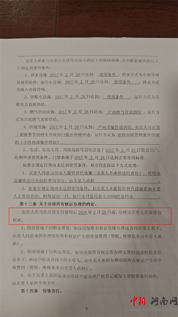 根據(jù)業(yè)主提供的原始購房合同,其所購入的15號樓房屋,屬于七里河城中村改造中的回購安置房。在“關(guān)于房屋所有權(quán)證辦理的約定”一欄顯示,“出賣人應(yīng)當(dāng)在房屋交付使用后2020年2月28日前,辦理完買受人房屋所有權(quán)證”。