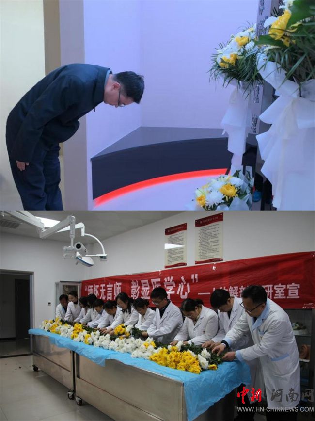 儀式結(jié)束后,師生代表依次向“無言良師”紀(jì)念碑敬獻(xiàn)鮮花。其余學(xué)生走進(jìn)人體解剖學(xué)第4實(shí)驗(yàn)室,向“大體老師”獻(xiàn)上菊花并鞠躬致禮。一朵朵鮮花寄托著哀思,更承載著對醫(yī)學(xué)精神的傳承之志。參與學(xué)生表示:“親手觸摸生命的奧秘,更深刻體會(huì)到‘大體老師’用身軀托起醫(yī)學(xué)未來的意義。我們定不負(fù)所托,成為有溫度、有擔(dān)當(dāng)?shù)尼t(yī)者。”