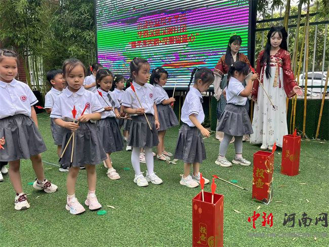 五名身著典雅漢服的社團成員翩躚而至,通過繪聲繪色的小話劇表演,將屈原的愛國故事娓娓道來,并生動介紹包粽子、賽龍舟等端午習俗。在妙趣橫生的投壺游戲環(huán)節(jié),社團成員教授幼兒投壺技巧,引導其在傳統(tǒng)競技中體驗古人的雅趣,鍛煉手眼協(xié)調(diào)能力。