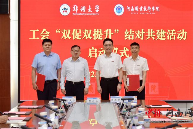 中新河南網(wǎng)6月12日電(胡艷) 6月11日下午,河南職業(yè)技術(shù)學(xué)院與鄭州大學(xué)在學(xué)校勤業(yè)樓舉行工會(huì)“雙促雙提升”結(jié)對(duì)共建簽約儀式。鄭州大學(xué)黨委副書記、工會(huì)主席韓國河,河南職業(yè)技術(shù)學(xué)院黨委書記厲勵(lì)出席簽約儀式并致辭。鄭州大學(xué)工會(huì)副主席楊根順,校黨委委員、副校長朱永寬參加簽約儀式。校黨委副書記、工會(huì)主席田華主持簽約儀式。