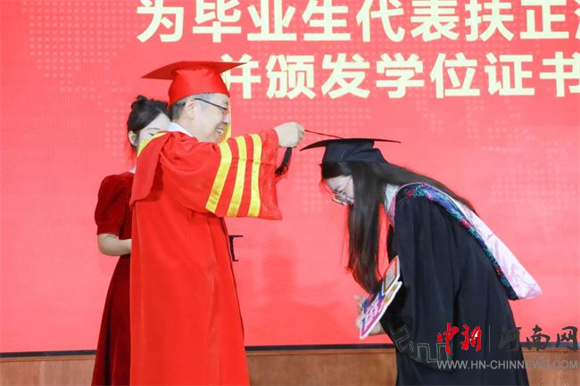 黨委書記馬治軍、校長吳中為獲得學(xué)士學(xué)位的2025屆畢業(yè)生代表扶正流蘇,并頒發(fā)學(xué)位證書。
