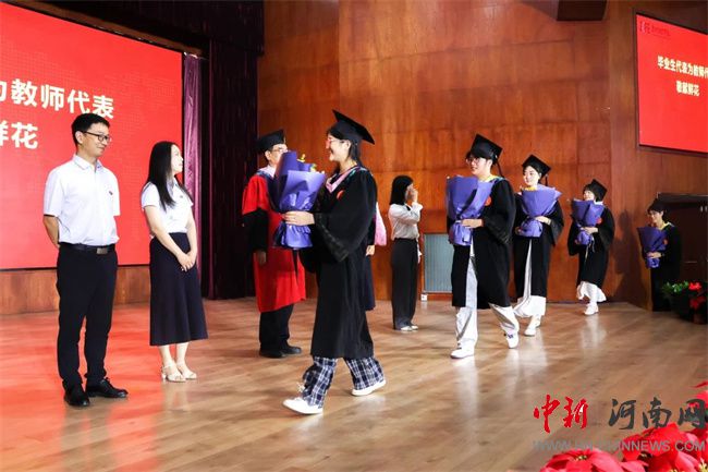 畢業(yè)生代表向教師代表敬獻(xiàn)鮮花,感謝各位老師的諄諄教誨。