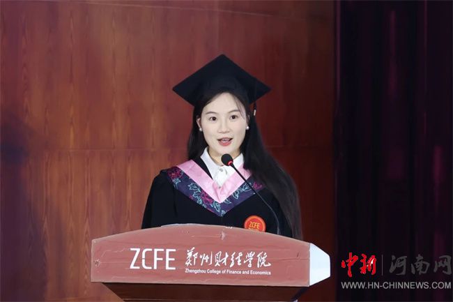 畢業(yè)生代表管理學(xué)院2021級(jí)酒店管理本科2班李家垚同學(xué)發(fā)言。她以“時(shí)光如水,記憶如磐”開篇,深情回顧了大學(xué)四年的校園時(shí)光,憶及樂水鑒、教學(xué)樓等承載難忘故事的校園景致;第二篇以“歲月安好,不負(fù)時(shí)光”為主題,分享參與抗疫志愿服務(wù)、暑期實(shí)踐、大型活動(dòng)服務(wù)等一路收獲的成長經(jīng)歷;第三篇以“飲水思源,結(jié)草銜環(huán)”為主題,感恩母校培育與師長教誨,慶幸遇見一群志同道合的朋友。最后號(hào)召同窗以鄭財(cái)人身份逐夢(mèng),愿大家心懷熱愛,奔赴山海。