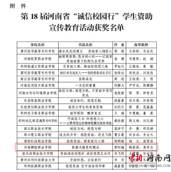 河南測繪職業(yè)學院在河南省“誠信校園行”學生資助宣傳教育活動中喜獲佳績