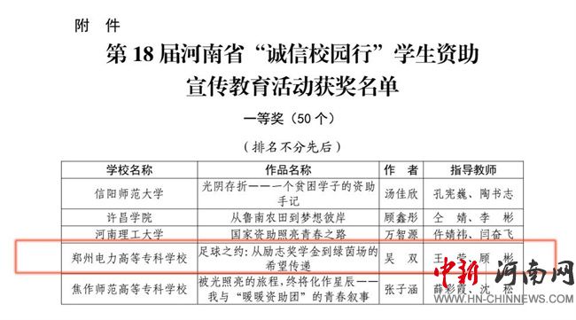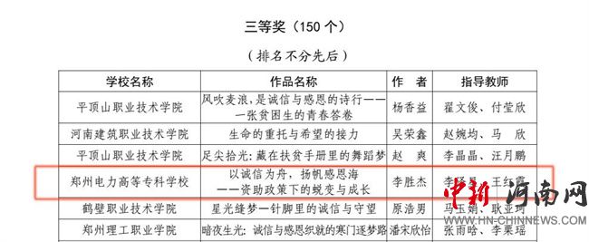 近年來,鄭州電力高等?茖W(xué)校全面落實(shí)立德樹人根本任務(wù),將資助與育人緊密結(jié)合,通過政策宣傳、誠信教育、感恩勵(lì)志等活動(dòng),著力培養(yǎng)學(xué)生的誠信品質(zhì)、感恩意識(shí)與社會(huì)責(zé)任感。此次獲獎(jiǎng)?wù)蔑@了鄭州電力高等?茖W(xué)校資助育人工作的扎實(shí)成效與學(xué)生綜合素質(zhì)的持續(xù)提升。