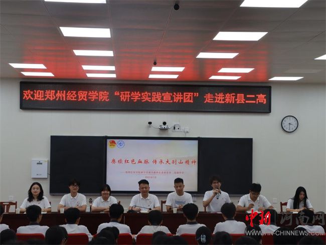 研學(xué)宣講進校,播撒紅色火種。7月2日下午,實踐團來到新縣第二高級中學(xué),開展以“賡續(xù)紅色血脈 傳承大別山精神”為主題的宣講活動。實踐團成員通過播放視頻、講述紅色故事、組織知識競答等形式,生動地向同學(xué)們展示了大別山精神的深刻內(nèi)涵。同學(xué)們積極參與互動,分享自己對紅色文化的理解和感悟;顒幼詈,在帶隊老師劉歡指揮下,全體師生共同合唱《我愛你中國》,用歌聲表達(dá)對祖國的熱愛和對革命先輩的敬意。