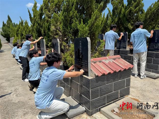 在輝縣市烈士陵園,實踐團成員手持抹布擦拭墓碑,在莊嚴(yán)肅穆的紀(jì)念碑前駐足瞻仰,追溯先烈足跡,以實際行動表達對革命先輩的無限敬仰與深切追念,讓紅色基因在青年大學(xué)生心中深深扎根。“我們今天的幸福生活,正是無數(shù)這樣的英雄用生命換來的。”河職師生用腳步丈量紅色土地,用心靈感悟著先輩的精神密碼,每一次擦拭都是無聲的對話,每一次凝視都是跨越時空的致敬。