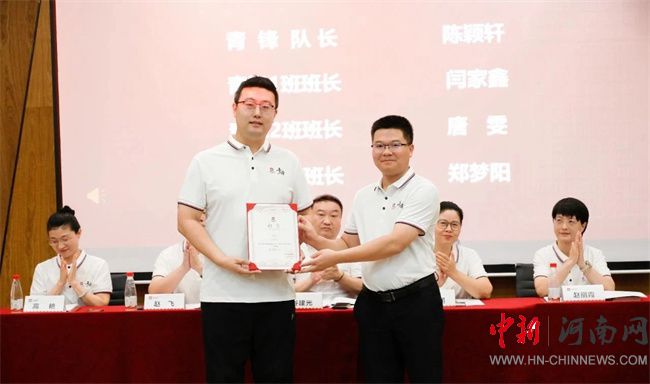 集團華信創(chuàng)智學(xué)堂校長李德彬為“青鋒”隊長陳穎軒頒發(fā)聘書。
