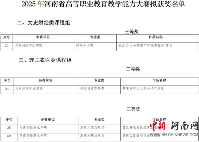 中新河南網(wǎng)7月24日電(文/陳賀) 近日,河南省教育廳公布 2025 年河南省高等職業(yè)教育教學(xué)能力大賽擬獲獎(jiǎng)名單。河南測繪職業(yè)學(xué)院報(bào)送的4個(gè)參賽作品均斬獲佳績,喜得二等獎(jiǎng)1項(xiàng)、三等獎(jiǎng)3項(xiàng),在該項(xiàng)賽事中實(shí)現(xiàn)新的突破。