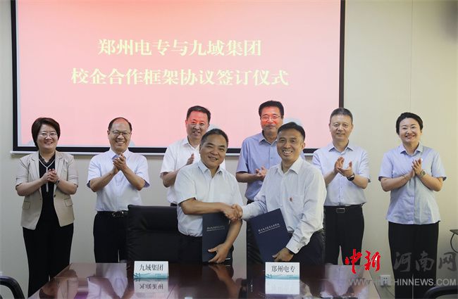 最后,鄭州電力高等?茖W(xué)校校長劉全璽與河南九域龍?jiān)措娏Πl(fā)展集團(tuán)有限公司總經(jīng)理王喜軍簽署了校企合作框架協(xié)議。