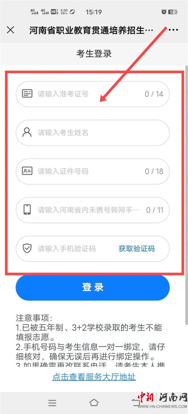 1.考生進(jìn)入“河南省職業(yè)教育貫通培養(yǎng)招生服務(wù)平臺(tái)”,點(diǎn)擊頁面下方的“考生登錄”按鈕;進(jìn)入頁面之后填寫考生的“準(zhǔn)考證號(hào)、姓名、身份證號(hào)、手機(jī)號(hào)(河南號(hào)碼)”,并輸入手機(jī)驗(yàn)證碼進(jìn)行登錄。如下圖: