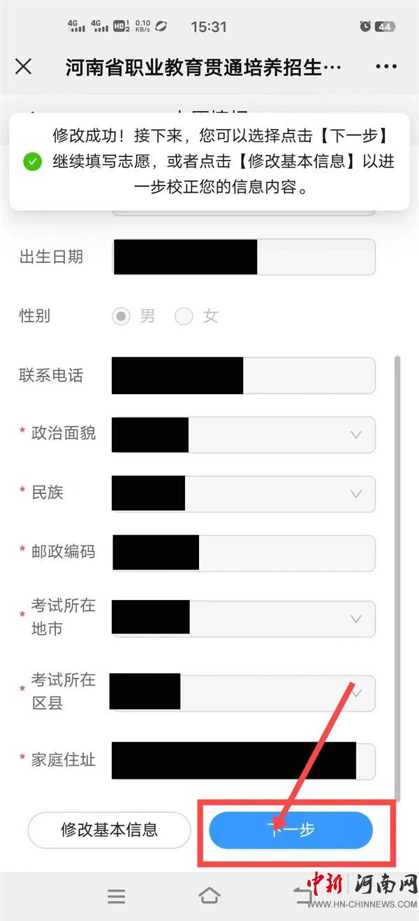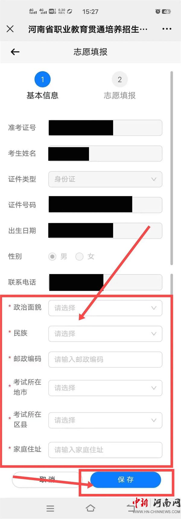 3.進(jìn)入“志愿填報(bào)”頁面之后,填寫考生的“政治面貌、民族、郵政編碼、考試所在地市、考試所在區(qū)縣、家庭住址”,然后點(diǎn)擊“保存”按鈕,接下來點(diǎn)擊“下一步”按鈕,進(jìn)行志愿填報(bào)。如下圖:
