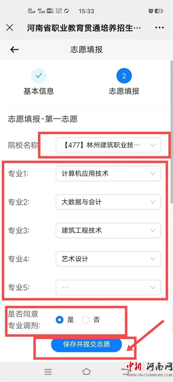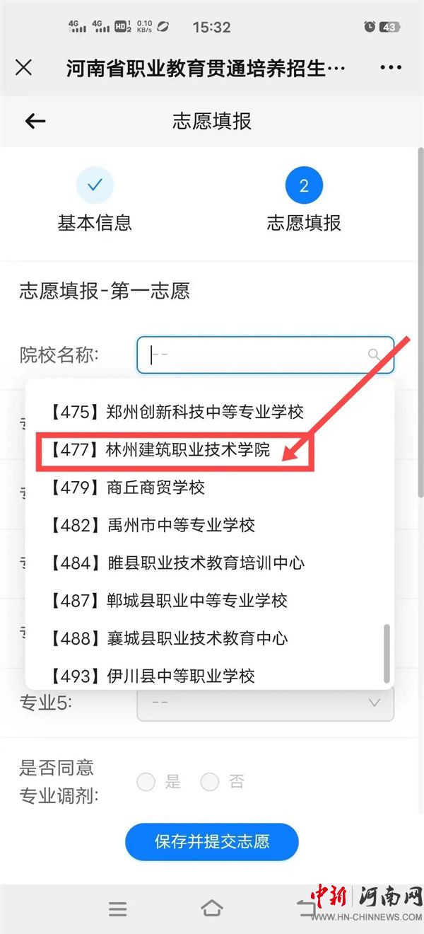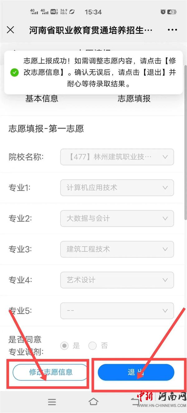 4.考生可填報(bào)兩個(gè)志愿,實(shí)行順序志愿投檔,每個(gè)志愿填報(bào)1所院校,每所院校填報(bào)1至5個(gè)專業(yè),并需確認(rèn)是否同意所報(bào)院校專業(yè)間調(diào)劑(填報(bào)學(xué)校志愿的考生,搜索院校名稱“【477】林州建筑職業(yè)技術(shù)學(xué)院”),然后點(diǎn)擊“保存并提交志愿”按鈕,最后系統(tǒng)顯示志愿上報(bào)成功。如需調(diào)整志愿內(nèi)容,請點(diǎn)擊“修改志愿信息”。確認(rèn)無誤后,請點(diǎn)擊【退出】并耐心等待錄取結(jié)果。如下圖: