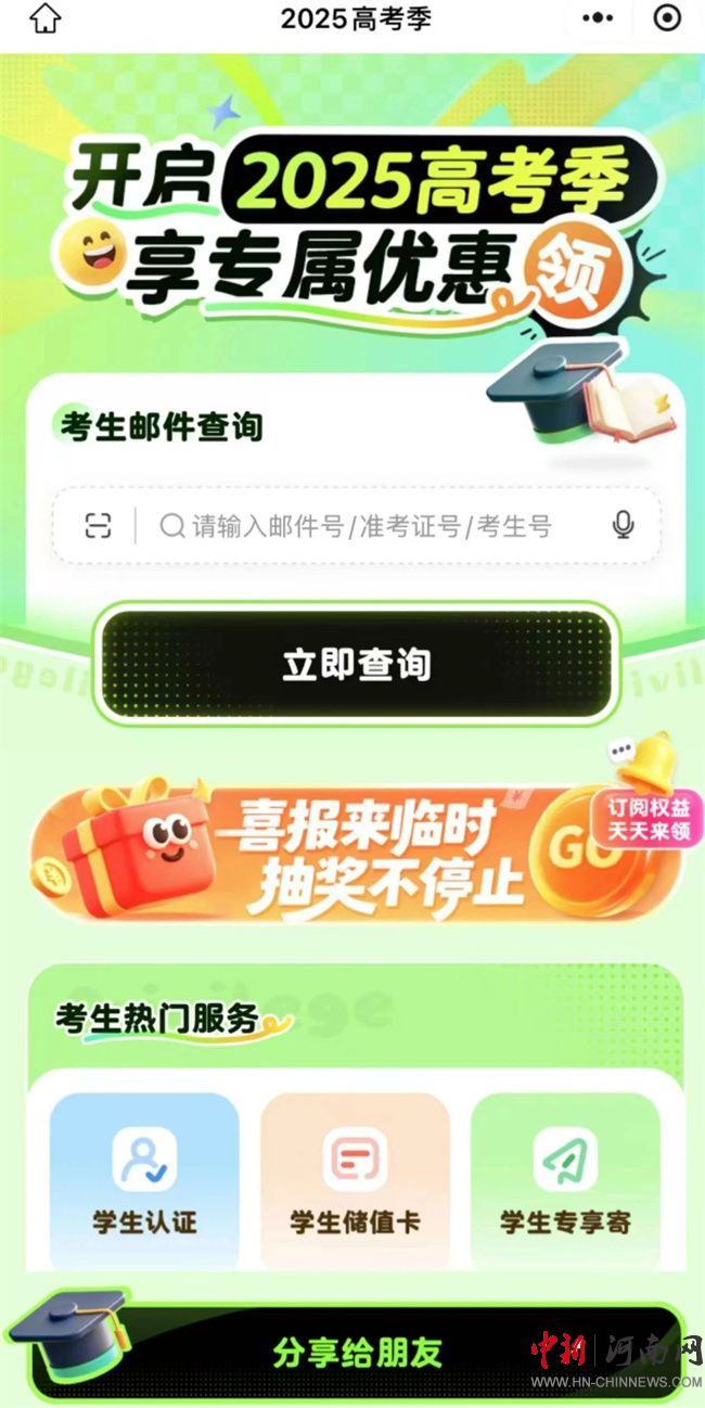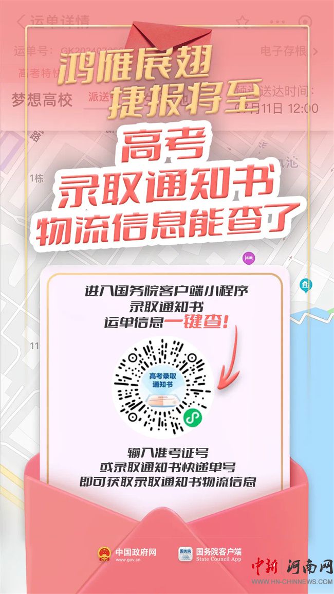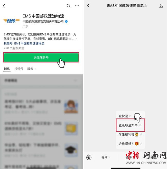 關注“EMS中國郵政速遞物流”微信公眾號,進入公眾號消息頁面,點擊菜單欄的“查件”,選擇“查錄取通知書”,輸入“準考證號”或“考生號”即可查詢。
