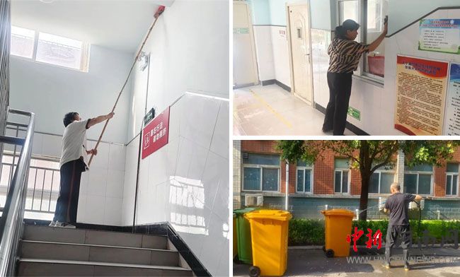 傍晚的夕陽下,保潔阿姨正彎腰擦拭教學(xué)樓和宿舍樓的每一層樓,讓愛融在細節(jié)里。