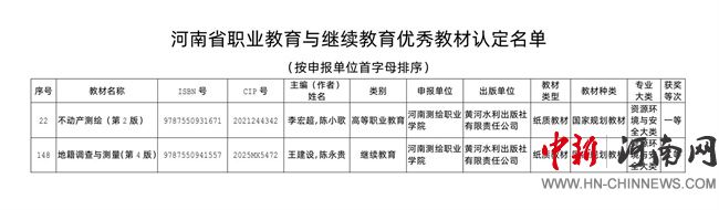 中新河南網(wǎng)10月17日電(文/田瑞娟) 近日,河南省教育廳公布2025年教材等級評定結(jié)果,河南測繪職業(yè)學(xué)院推薦的兩本教材雙雙獲獎。其中,《不動產(chǎn)測繪(第二版)》榮獲職業(yè)教育與繼續(xù)教育類一等獎,《地籍調(diào)查與測量(第四版)》榮獲二等獎。