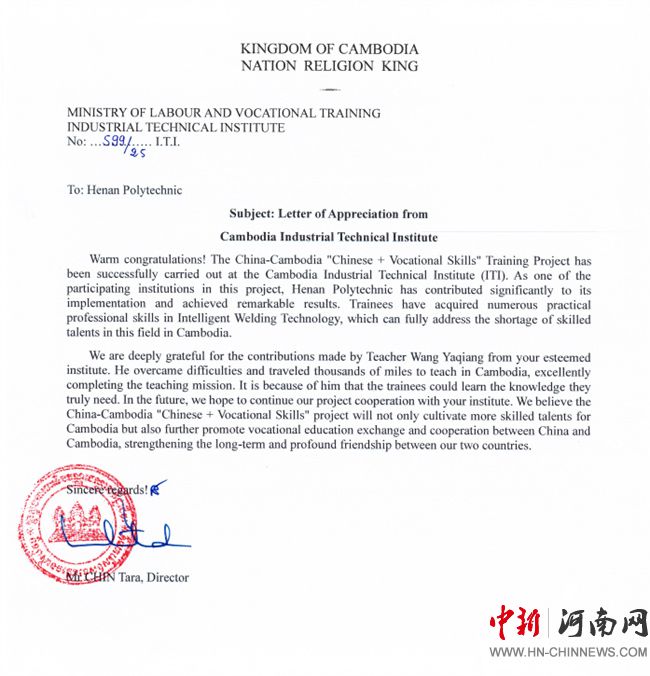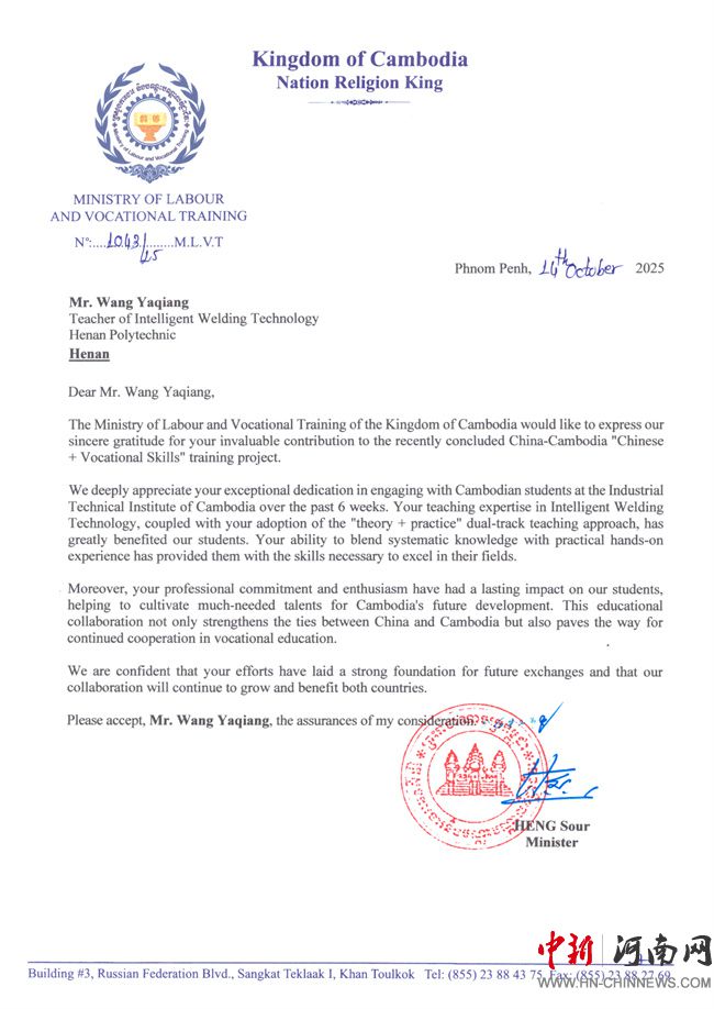 中新河南網(wǎng)10月29日電(王亞強、韓瑞) 近日,河南職業(yè)技術(shù)學(xué)院收到來自柬埔寨勞工與職業(yè)培訓(xùn)部和工業(yè)技術(shù)學(xué)院發(fā)來的兩封感謝信。信中寫道:感謝你們?yōu)橹袊?mdash;柬埔寨“中文+職業(yè)技能”項目所做的貢獻,王亞強老師傾心指導(dǎo)柬埔寨學(xué)員的敬業(yè)精神令人感佩,您憑借智能焊接技術(shù)領(lǐng)域的專業(yè)造詣,采用“理論+實踐”雙軌并行的教學(xué)模式,使學(xué)員們受益匪淺……