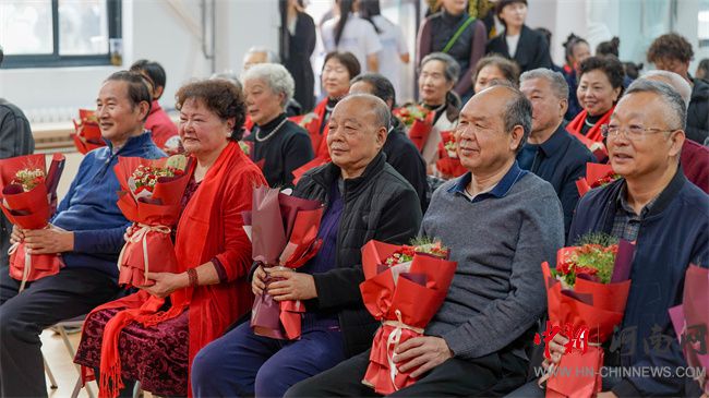 活動(dòng)現(xiàn)場(chǎng),學(xué)生代表手捧康乃馨、長(zhǎng)壽花等寓意美好的鮮花,逐一獻(xiàn)給在場(chǎng)的老人,表達(dá)對(duì)長(zhǎng)輩們的崇高敬意和美好祝愿。