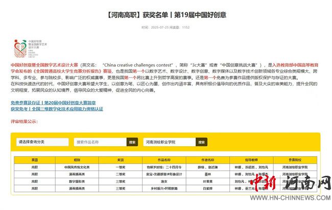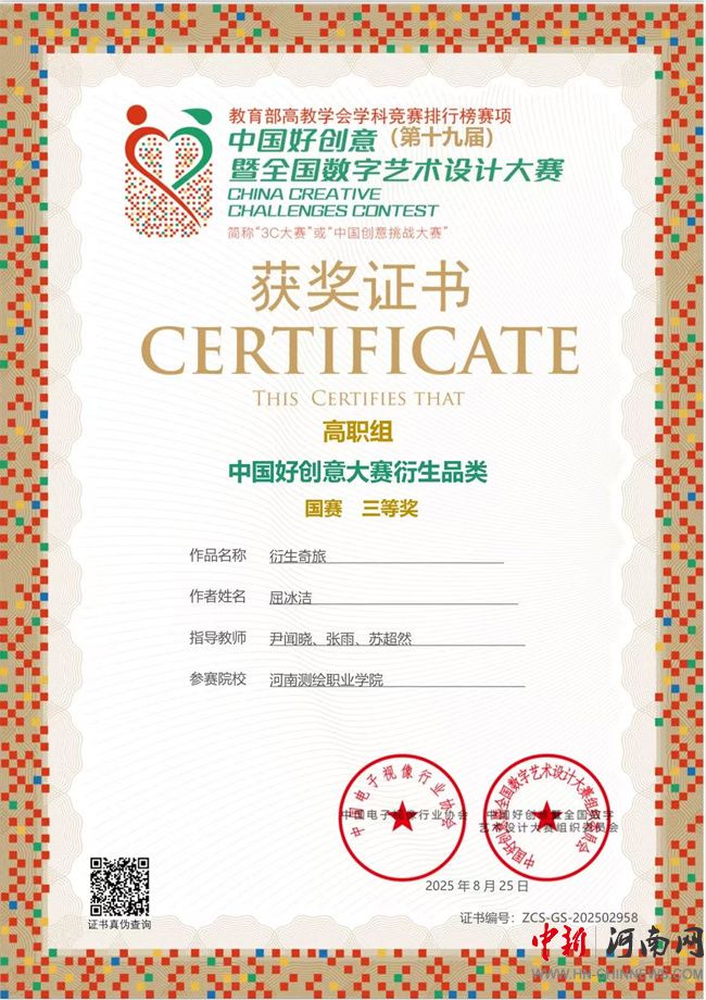 中新河南網(wǎng)11月7日電(文/尹聞曉) 近日,第19屆中國好創(chuàng)意暨全國數(shù)字藝術設計大賽全國總決賽結(jié)果揭曉。河南測繪職業(yè)學院參賽團隊表現(xiàn)出色,共獲全國三等獎1項、省級一等獎1項、二等獎1項、三等獎2項,實現(xiàn)了該校在該項國家級賽事中的成績新突破。