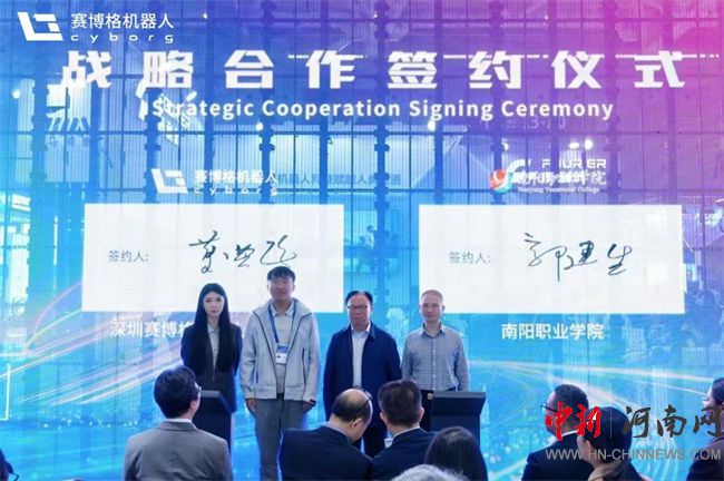 11月14日,考察團(tuán)一行到訪第二十七屆中國(guó)國(guó)際高新技術(shù)成果交易會(huì)(高交會(huì))現(xiàn)場(chǎng),受邀參加了深圳賽博格機(jī)器人科技有限公司的戰(zhàn)略合作簽約儀式。李煥志圍繞校企深度合作,共同探索“人工智能+教育”的新路徑、新模式發(fā)表致辭。郭建生代表南陽職業(yè)學(xué)院與賽博格公司現(xiàn)場(chǎng)簽約。簽約儀式結(jié)束后,考察團(tuán)一行看望、慰問了在賽博格工作的學(xué)校優(yōu)秀學(xué)子王準(zhǔn)和徐夢(mèng)輝兩位同學(xué),對(duì)他們?cè)谫惒└袼〉玫某煽?jī)表示肯定和贊揚(yáng),鼓勵(lì)他們繼續(xù)努力,以優(yōu)異的成績(jī)回報(bào)社會(huì)。