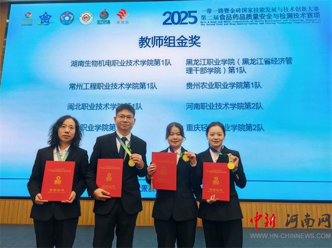 中新河南網(wǎng)11月26日電(崔萌甜)近日,2025“一帶一路”暨金磚國(guó)家技能發(fā)展與技術(shù)創(chuàng)新大賽——第二屆食品藥品質(zhì)量安全與檢測(cè)技術(shù)賽項(xiàng)在湖南長(zhǎng)沙舉行。河南職業(yè)技術(shù)學(xué)院食品工程學(xué)院教師侯麗芬、崔萌甜、寧夢(mèng)鴿、滿勇組隊(duì)參賽,憑借扎實(shí)的專業(yè)功底、精湛的操作技能與出色的團(tuán)隊(duì)協(xié)作,在全國(guó)76支教師參賽隊(duì)伍中脫穎而出,榮獲一等獎(jiǎng),展現(xiàn)了學(xué)校教師的卓越風(fēng)采。