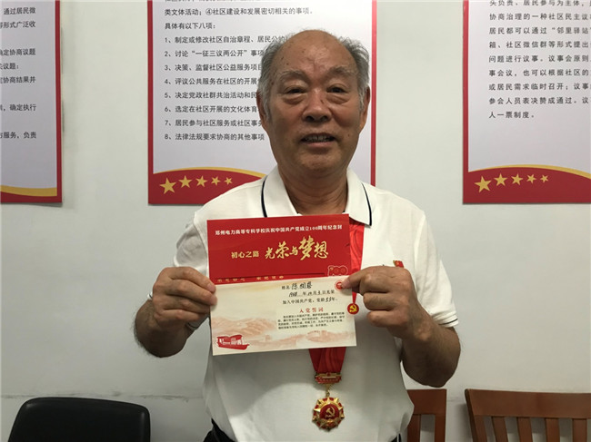 學(xué)校離退休黨員、“光榮在黨50年”紀(jì)念章獲得者陳相恩老師打開(kāi)黨員紀(jì)念封,將內(nèi)頁(yè)徐徐拉出,伴隨著紅船從誕生地劃到100年,腦海里不斷涌現(xiàn)著中國(guó)共產(chǎn)黨百年風(fēng)華的壯闊征程,在內(nèi)頁(yè)上工工整整的寫(xiě)上了自己的名字和黨齡,每一筆都書(shū)寫(xiě)著自己作為一名共產(chǎn)黨員的初心使命,每一劃都鐫刻著在黨十五年的光榮與夢(mèng)想……