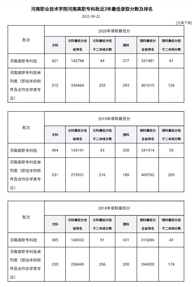 河南職業(yè)技術(shù)學院河南高職專科批近3年最低錄取分數(shù)及排名