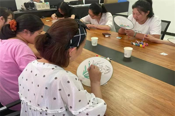 隨后職工們拿起畫筆蘸上各色顏料,在老師的指導(dǎo)下,將自己心中的荷花、梅花一一描畫到扇面上。一個多小時后,一幅幅精美的扇子繪制完成了,開心的拿起自己的作品互相展示交流,輕搖折扇微風(fēng)徐來,為炎炎夏日帶來絲絲清涼,也將團(tuán)扇文化根植在職工們的心中。