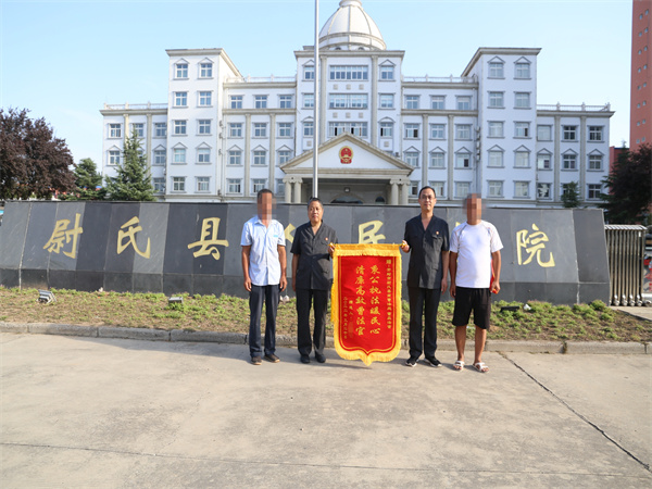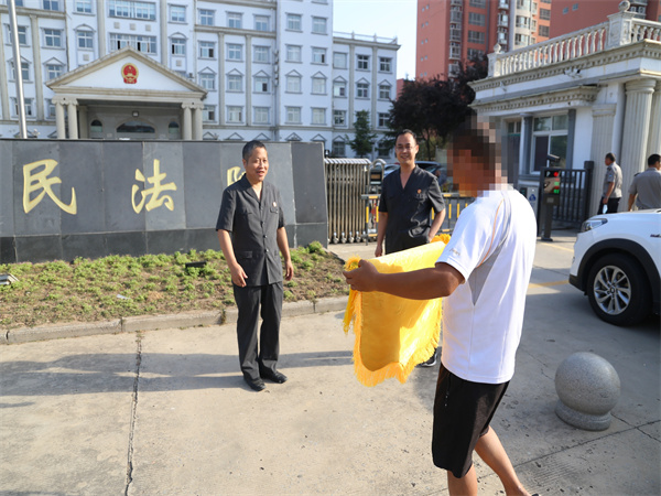 中新河南網(wǎng)9月22日電:早上八點(diǎn),馮老漢懷抱一面錦旗來(lái)到尉氏縣人民法院,雙手將其遞交到蔡莊法庭庭長(zhǎng)曹磊手中,他對(duì)曹磊庭長(zhǎng)不懼麻煩、公正審判自己的案件表達(dá)由衷謝意。