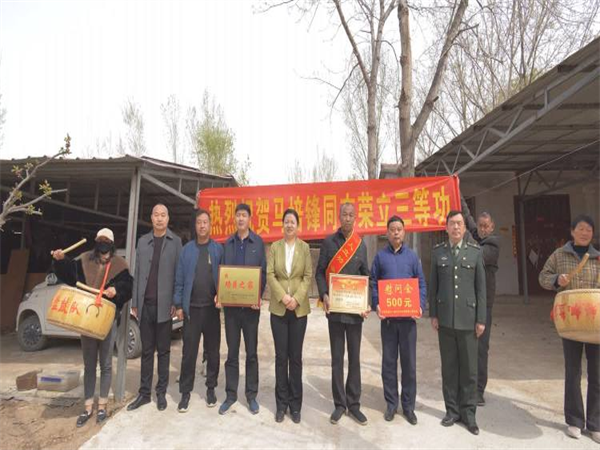 中新河南網(wǎng)3月16日電:一張喜報(bào)、全家光榮,立功受獎(jiǎng)是軍人榮譽(yù)的象征。3月15日上午,在喜慶的鑼鼓聲中,開封市示范區(qū)杏花營農(nóng)場(chǎng)黨委書記郝敏、副書記孫紅光、正科級(jí)干部王志國及退役軍人服務(wù)站、武裝部全體工作人員來到杏花營農(nóng)場(chǎng)秫米店社區(qū),為榮立三等功的現(xiàn)役軍人家屬送立功喜報(bào)和慰問金,表達(dá)黨和政府對(duì)立功軍人家屬的關(guān)懷和問候。