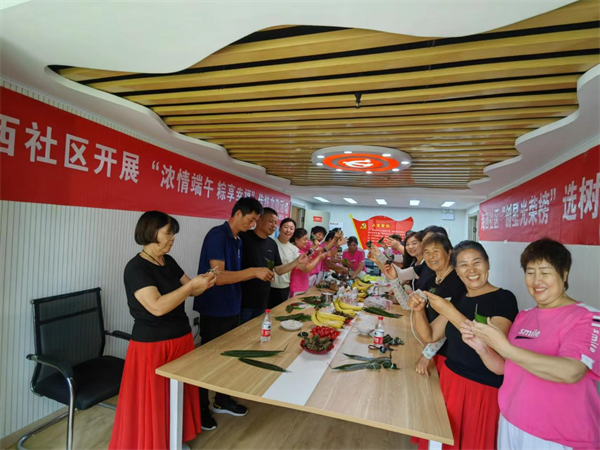 活動(dòng)以端午民俗知識(shí)的分享開始,暢談端午節(jié)近年來社區(qū)變化。隨后,黨員志愿者拿出提前準(zhǔn)備好的糯米、紅棗、粽葉等材料,大家圍坐在一起,包粽子、敘家常,現(xiàn)場(chǎng)歡聲笑語,其樂融融。