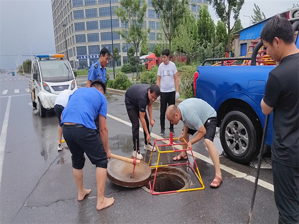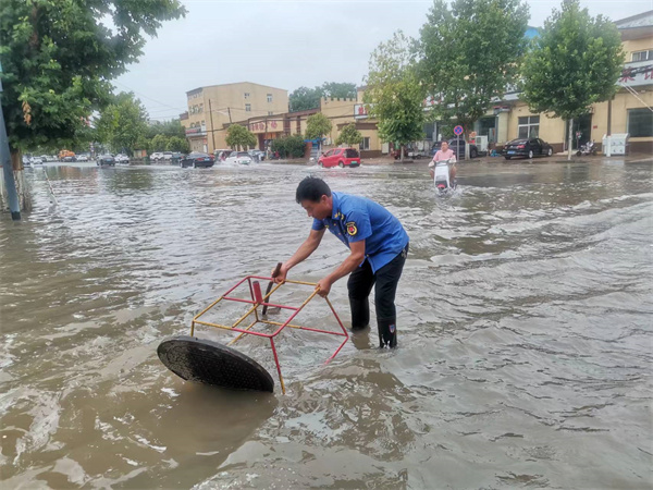 三是及時(shí)清理積水。通過不間斷巡查對轄區(qū)內(nèi)低洼地段的積水進(jìn)行清掃,通過設(shè)置警示標(biāo)志,打開窨井蓋加快排水;對于積水較深路段利用抽水設(shè)備,加快排水,確保排水通暢,全力保障道路通行秩序。
