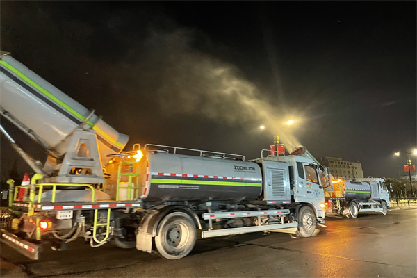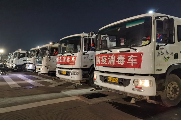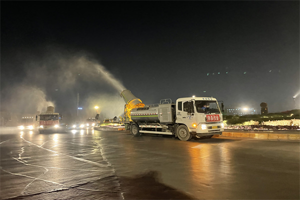 晚9點,工作人員和消殺車輛已全部準(zhǔn)備就緒,隨著裝有消毒水的大型霧炮車、步道車、消毒灑水車緩緩駛向街道,消殺工作全面啟動。