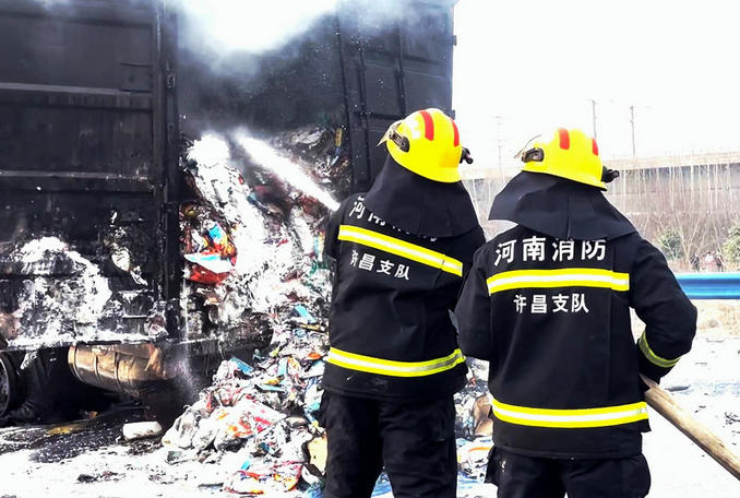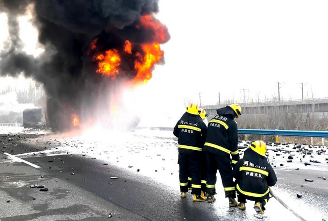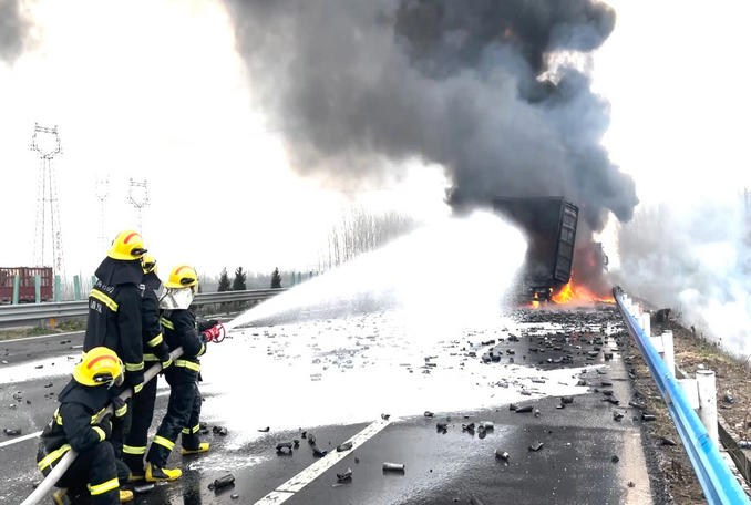 河南許昌:京港澳高速兩貨車追尾起火 消防隊員緊急趕赴處置救援
