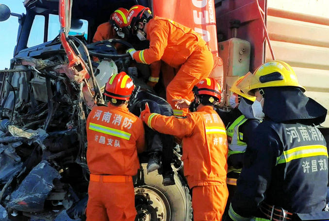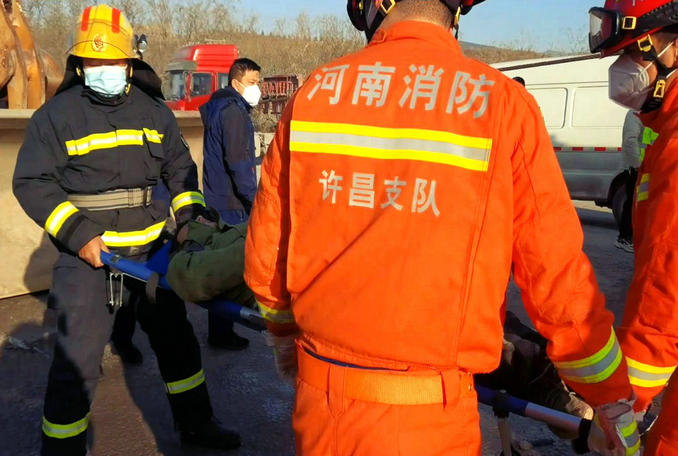 河南禹州:渣土車追尾半掛車一人被困 消防隊員立即趕赴現(xiàn)場救援