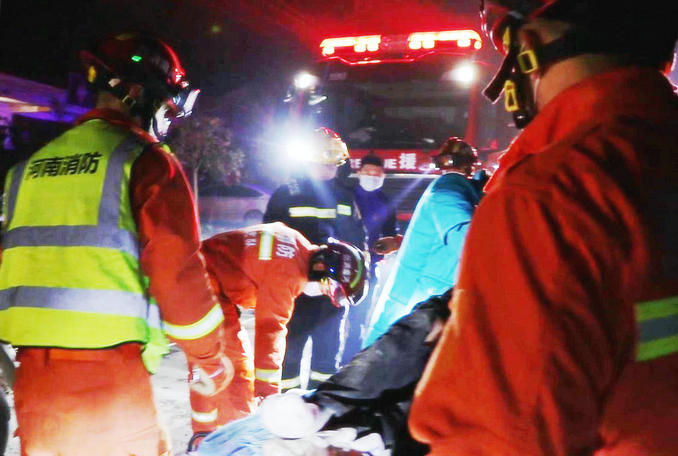 經(jīng)過緊張救援,被困人員被成功救出,消防隊員將其抬到救護車上面,由醫(yī)護人員送往醫(yī)院進行救治。