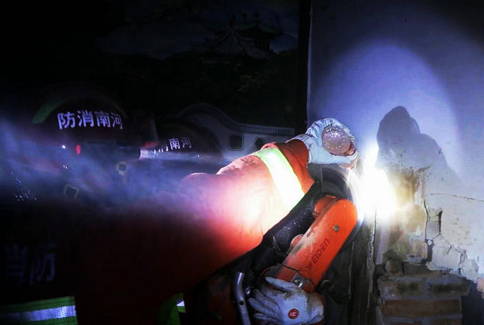 隨后,救援人員使用沖擊鉆等工具對墻體進行破拆。