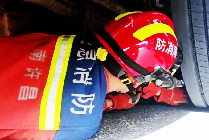 救援人員立即展開營救方案,首先利用液壓頂桿將車頭頂起,隨后兩名消防員鉆入車底,一人托起老人頭部,另一人協(xié)助老人從車輪下移出,并不斷安撫被困者。