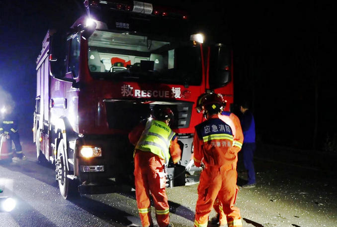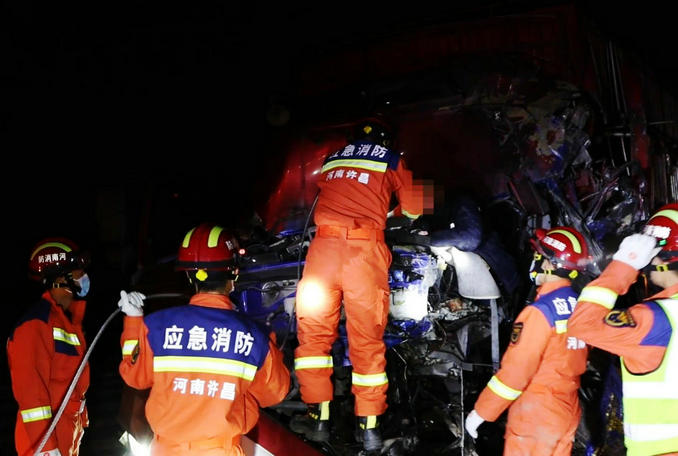 河南鄢陵:占道行駛導致兩輛貨車相撞 消防隊員迅速趕赴破拆救援