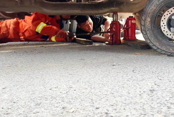 由于車底空間狹小,給救援工作帶來(lái)諸多不便。現(xiàn)場(chǎng)指揮員立即安排一名經(jīng)驗(yàn)豐富的消防員,攜帶千斤頂?shù)裙ぞ咩@入車底,利用千斤頂將貨車的車頭一點(diǎn)點(diǎn)抬起。
