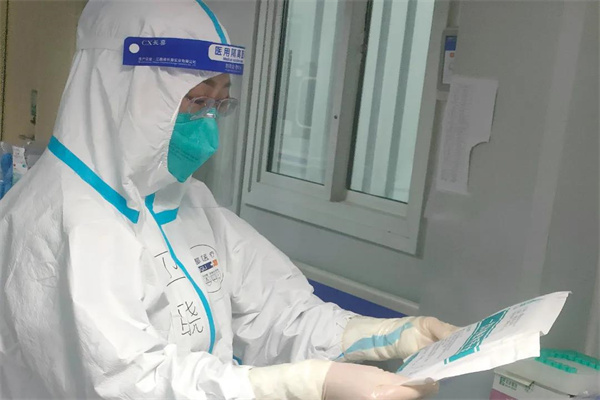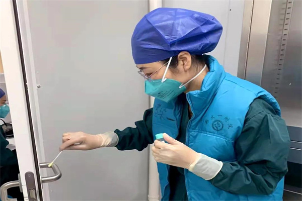 在岐伯山醫(yī)院,衛(wèi)曉梅主要負責(zé)對所有工作人員進行穿脫防護用品、職業(yè)暴露、血液體液賤撒、呼吸道職業(yè)暴露、地面物表消毒培訓(xùn),進入污染區(qū)指導(dǎo)采樣人員采樣、送檢,指導(dǎo)病區(qū)每班消毒和終末消毒。24小時全方位對一脫、二脫工作人員防護用品脫卸進行監(jiān)督。每周兩次進行高頻接觸物體表面采樣,每天對科室清潔區(qū)和污染區(qū)進行督導(dǎo),對發(fā)現(xiàn)問題,現(xiàn)場溝通,現(xiàn)場協(xié)調(diào)解決,閉環(huán)管理。嚴格檢查規(guī)避醫(yī)護人員、患者、隔離區(qū)域隨時存在的感染風(fēng)險。她的工作繁瑣而復(fù)雜,需要細致入微、步步到位。每次一進入病區(qū),衛(wèi)曉梅就變成了“失聯(lián)”的狀態(tài),一整天無法與其聯(lián)系。有好幾次她上小學(xué)的兒子實在太想念媽媽,就偷偷給她打電話,但是卻總是無人接聽。
