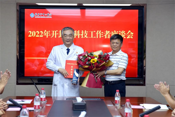 會議第一階段,開封市“最美科技工作者”頒獎,穆宏地主任為2022年開封“最美科技工作者”獲得者李擁軍頒獎,根據市委組織部、市委宣傳部、市科協(xié)、市工信局、市科技局、市人社局、市教體局《關于開展2022年開封“最美科技工作者”學習宣傳活動的通知》(汴科協(xié)文〔2022〕8號)要求,經過廣泛發(fā)動、層層推薦、資格審核、專家遴選、集體研究等程序,李擁軍主任獲得2022年開封“最美科技工作者”稱號。