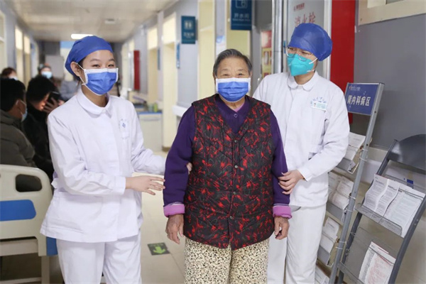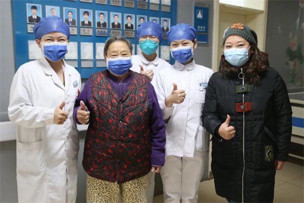 中新河南網(wǎng)1月18日電: “來(lái)奶奶,看鏡頭!”王奶奶在醫(yī)護(hù)和女兒的環(huán)繞下,身著一身棉衣,站在熙熙攘攘的科室走廊上,舉起大拇指,在鏡頭前露出微笑。經(jīng)過(guò)和新冠病毒長(zhǎng)達(dá)3個(gè)月的輸死較量,現(xiàn)年86歲的王奶奶將從開(kāi)封市中心醫(yī)院出院。