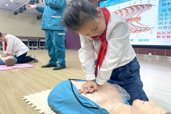 緊接著,朱林圍繞應(yīng)對氣道異物的各種體位的海姆立克急救法,燒燙傷的緊急處置、各種關(guān)節(jié)扭傷及應(yīng)急處理、鼻出血和各種外傷的止血手法和包扎固定,發(fā)熱的緊急處置等校園常見疾病的急救知識和急救手法展開了生動形象的講解與演示。