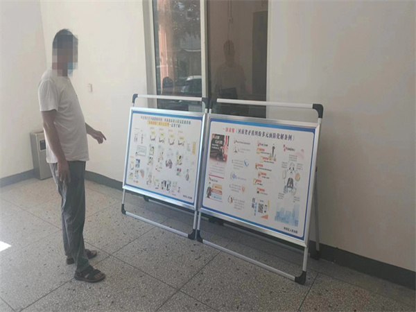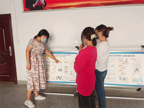 活動中,干警深入社區(qū)(村)開展宣傳,入戶發(fā)放宣傳頁并采取通俗易懂、接地氣的語言向群眾細致講解《條例》的立法目的、主要內(nèi)容、解紛途徑等,鼓勵和引導群眾在發(fā)生矛盾糾紛時,優(yōu)先選擇和解、調(diào)解途徑化解糾紛;同時在廣場、沿街商鋪等人群聚集地集中設置宣傳展板,現(xiàn)場宣傳并為群眾答疑解惑,提高了群眾的認知度、知曉率,促進了矛盾糾紛多元化解和源頭治理。
