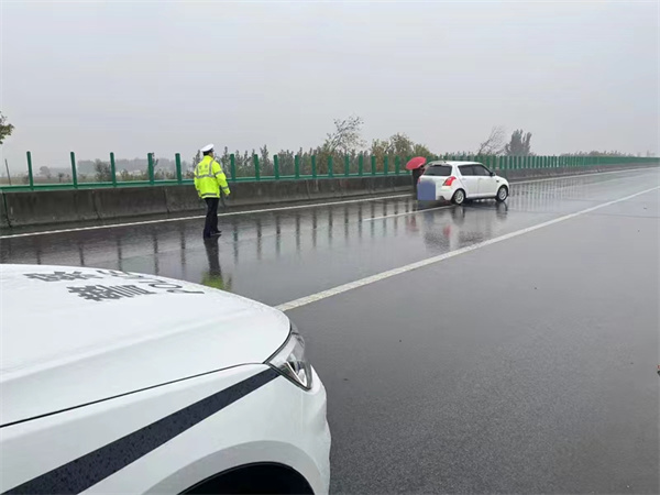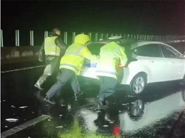 10月1日3點(diǎn)10分左右,濮陽(yáng)高速交警支隊(duì)事故民警巡邏至大廣高速1829公里處,發(fā)現(xiàn)一輛白色小橋車(chē)滅著燈停在高速公路行車(chē)道上。此時(shí)天空正下著大雨,又遇國(guó)慶假期車(chē)流高峰,不時(shí)有車(chē)輛從旁邊響著喇叭急馳而過(guò),存在嚴(yán)重安全隱患。民警見(jiàn)狀立即停車(chē)前去處理,經(jīng)詢(xún)問(wèn)得知,駕駛員王某和朋友兩人一起開(kāi)車(chē)出行游玩,行駛至該路段時(shí)車(chē)輛突然故障,車(chē)停在了路上,正手足無(wú)措時(shí)看到了高速交警。情況緊急,民警立即冒雨將車(chē)輛推移至應(yīng)急車(chē)道,設(shè)置警示區(qū),并聯(lián)系施救車(chē)輛,及時(shí)消除了交通安全隱患。