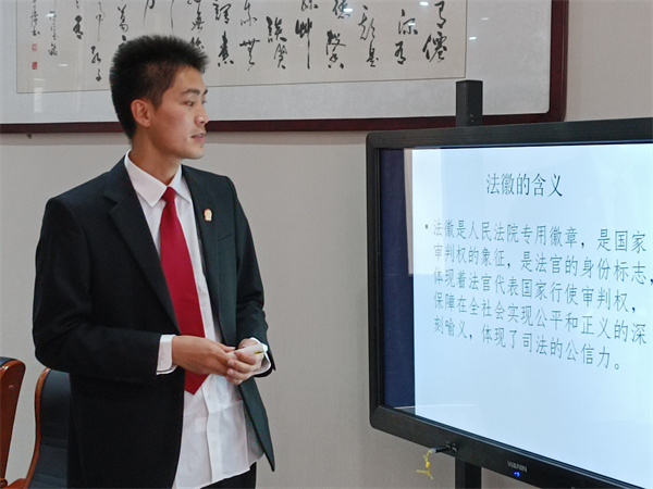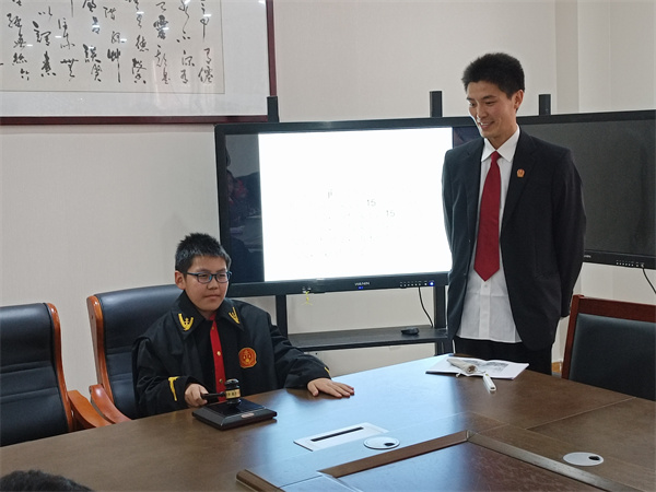 喬啟東法官以現(xiàn)場展示法徽、法槌和法袍為切入點(diǎn),向同學(xué)們介紹法徽、法槌、法袍的重要含義,并進(jìn)一步講解我國司法制度和庭審模式,使同學(xué)們對法院日常工作有直觀了解。在活動中,同學(xué)們在法官的引導(dǎo)下,仔細(xì)觀察法徽、法槌和法袍的樣式圖案,并親身穿上法袍、敲擊法槌,體驗(yàn)“庭審”程序。