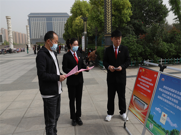 4月15日,尉氏法院組織干警到人民廣場開展“4.15國家安全教育日”普法宣傳活動。