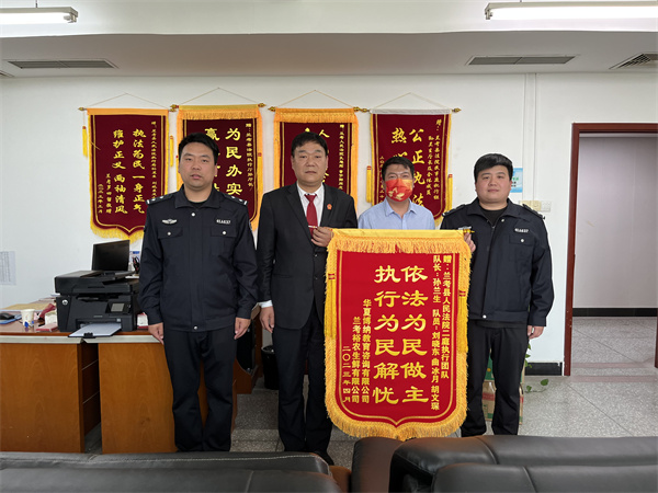 4月27日,徐某按照約定將剩余款項(xiàng)打至法院賬戶,案款到賬后,執(zhí)行干警第一時(shí)間聯(lián)系申請(qǐng)人將案款領(lǐng)走并簽發(fā)結(jié)案手續(xù),兩起案件順利執(zhí)行完畢。在執(zhí)行的過(guò)程中,劉某被執(zhí)行干警劉曉東等人的敬業(yè)奉獻(xiàn)精神所感動(dòng),送錦旗表示感謝。