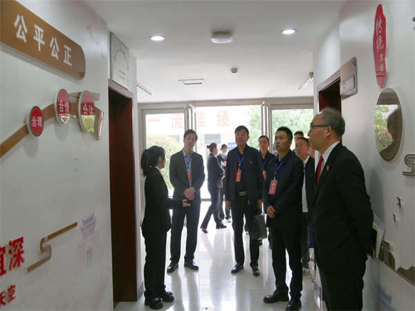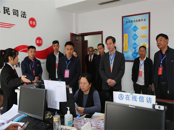 王風(fēng)來(lái)一行實(shí)地查看了矛盾糾紛多元化解中心、執(zhí)行事務(wù)接待中心、宋付振調(diào)解室、在線多元化解平臺(tái)工作室等辦公區(qū)域。